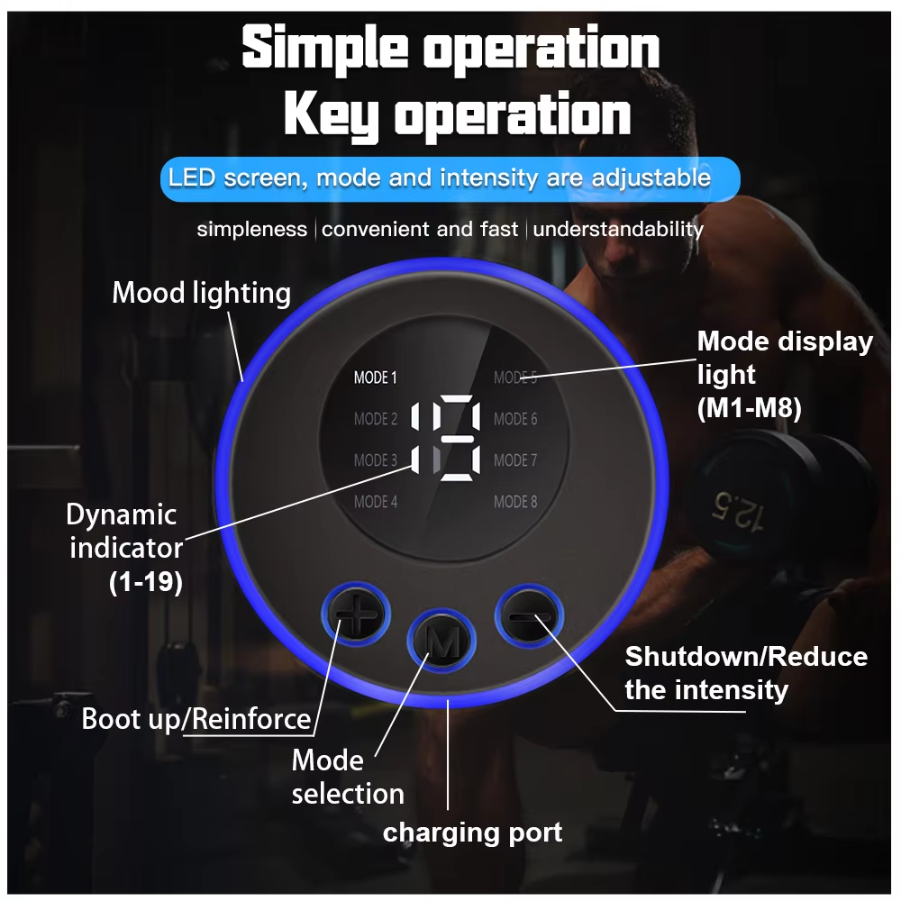 MuscleEase offers 8 training modes and 19 adjustable intensity levels so you can customize your workout — from light massage to strong muscle training.
