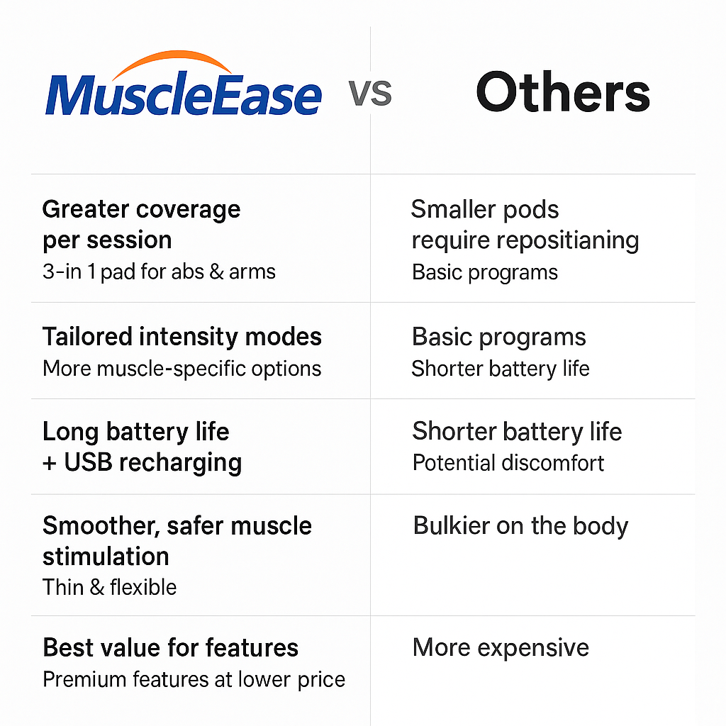 While competitors require multiple small pods and repositioning to treat large zones, MuscleEase’s 3-in-1 design covers abs, arms, and core with fewer changes — saving time and enhancing convenience.