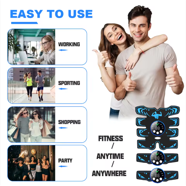 MuscleEase is a next-generation USB rechargeable wireless muscle stimulator designed to help you strengthen, tone, and recover — anytime, anywhere. With its 3-in-1 pad system for abs, arms, and other body parts, it delivers targeted electrical muscle stimulation (EMS) to activate muscles, improve circulation, and reduce fatigue.